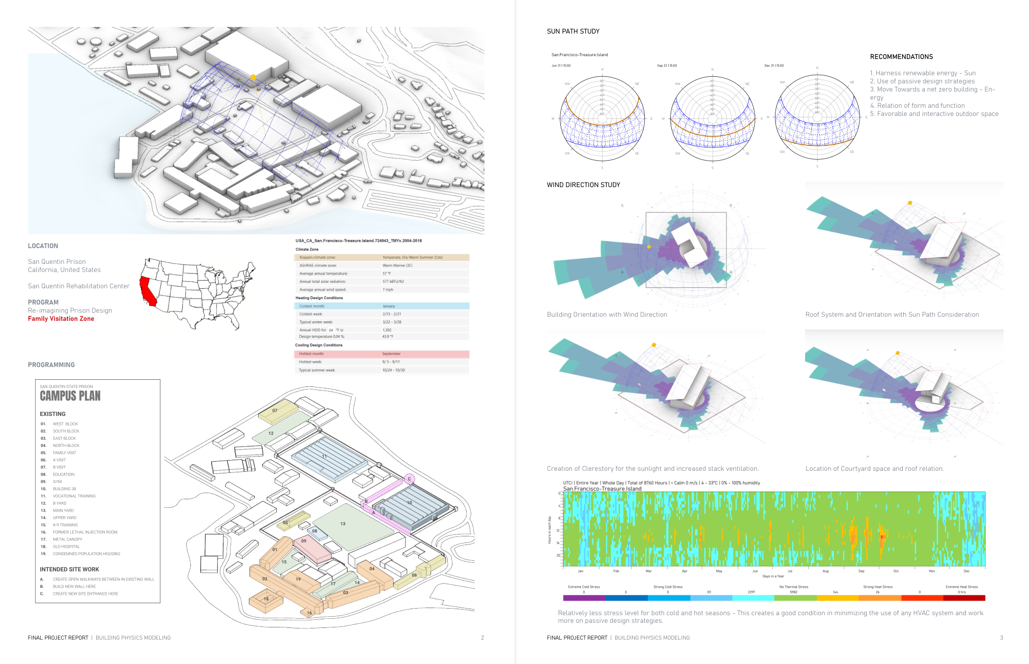 At the end of the course, students will have developed a thorough understanding of environmental boundary conditions and their influence on building systems, physics, design, and sustainability. Students will be able to use the tools mentioned above to design spaces that maximize comfort while minimizing environmental impact. Students are encouraged to implement these techniques into their studio projects and reflect on how building performance considerations can inform their architectural decision-making.